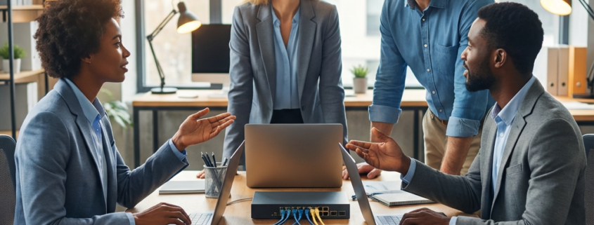 Photorealistic mid-article shot of a small business office scene, an IT technician configuring a network switch while a pr...