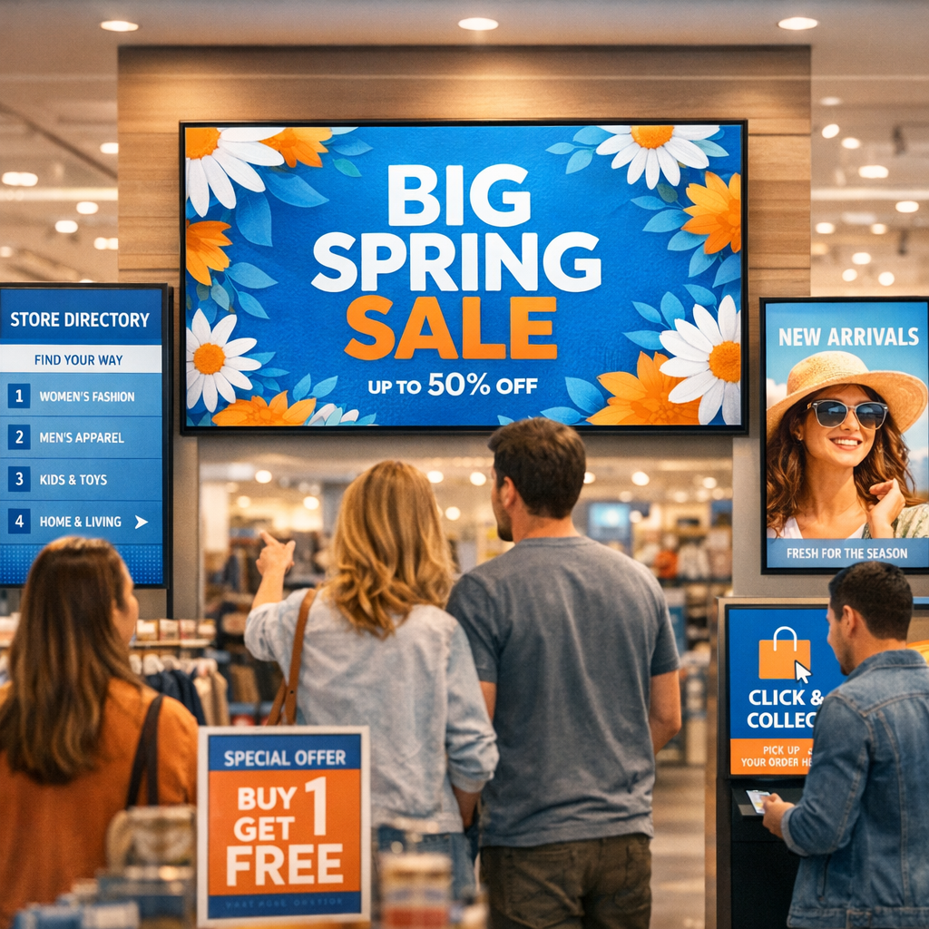 Digital signage is any electronic display system used to show content like ads, menus, wayfinding, or live information inside or outside a retail store. Screens can be TVs, LED walls, kiosks, or tablets. Content is controlled centrally through software, so updates are fast and consistent across locations. Retailers use digital signage for window displays, checkout upsells, informational kiosks, and staff communications.